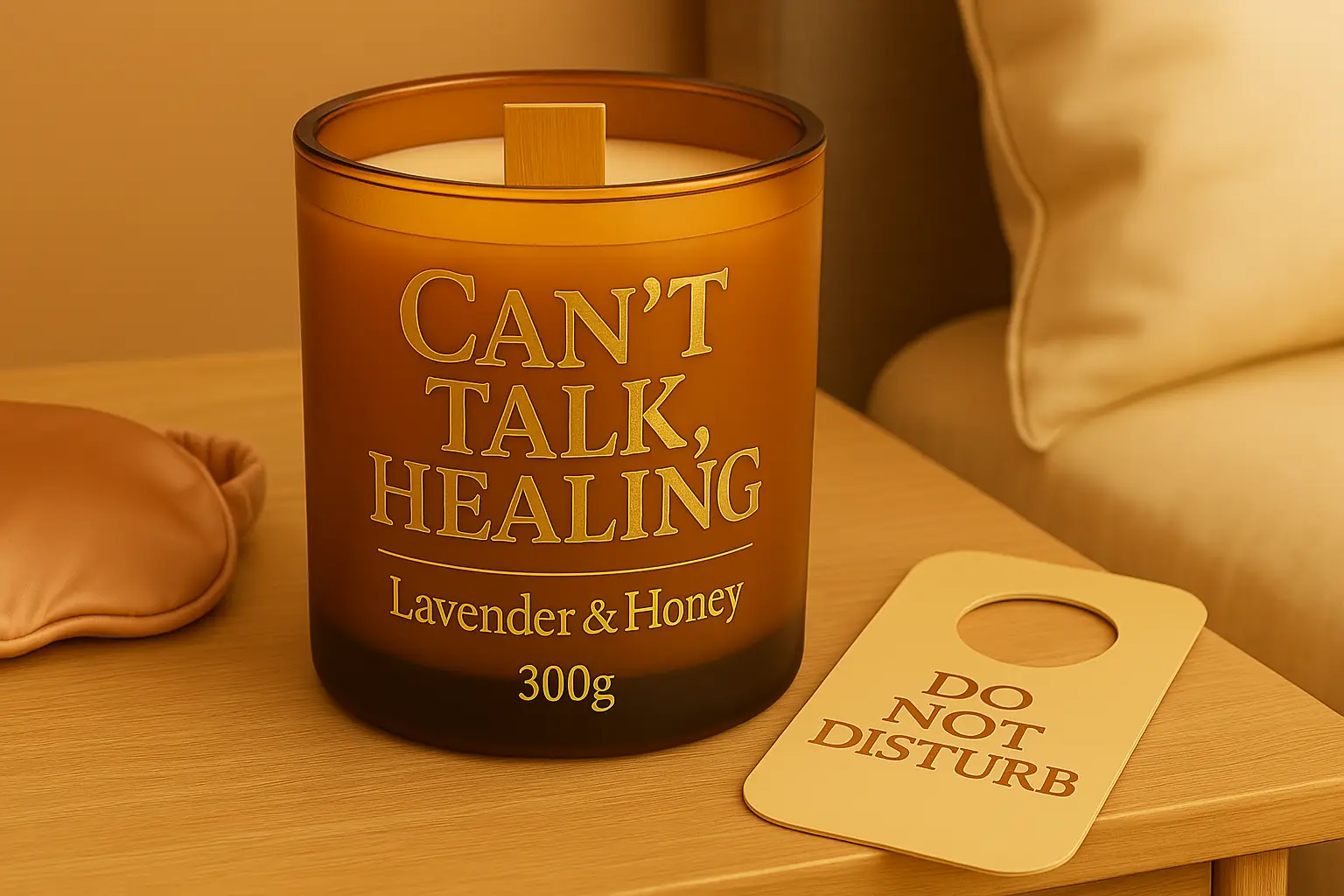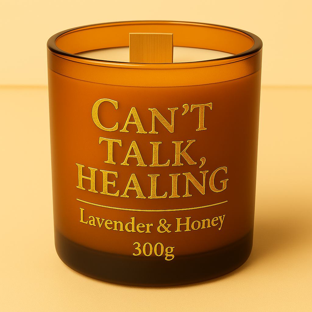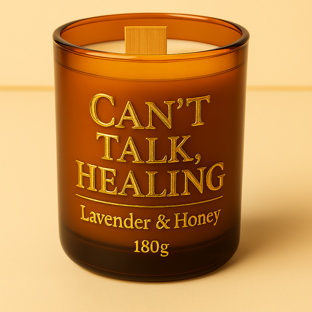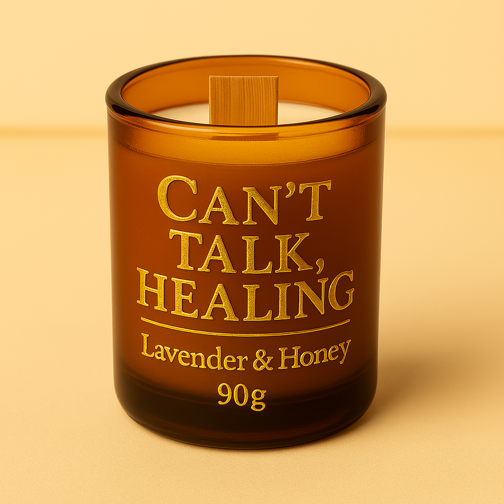 Slogan : “Can’t Talk. Healing.” imprimé en doré